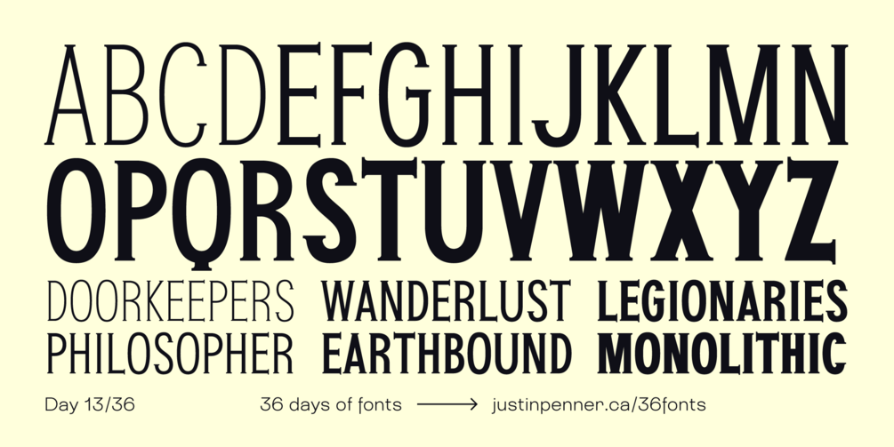 Follow the 36 Days of Fonts project for a new font every day! Post your feedback on Instagram or send me an email justin@justinpenner.ca. If you use this font, show me your work or tag it #36fontsinuse, and if you want to see it expanded to a full character set, let me know!