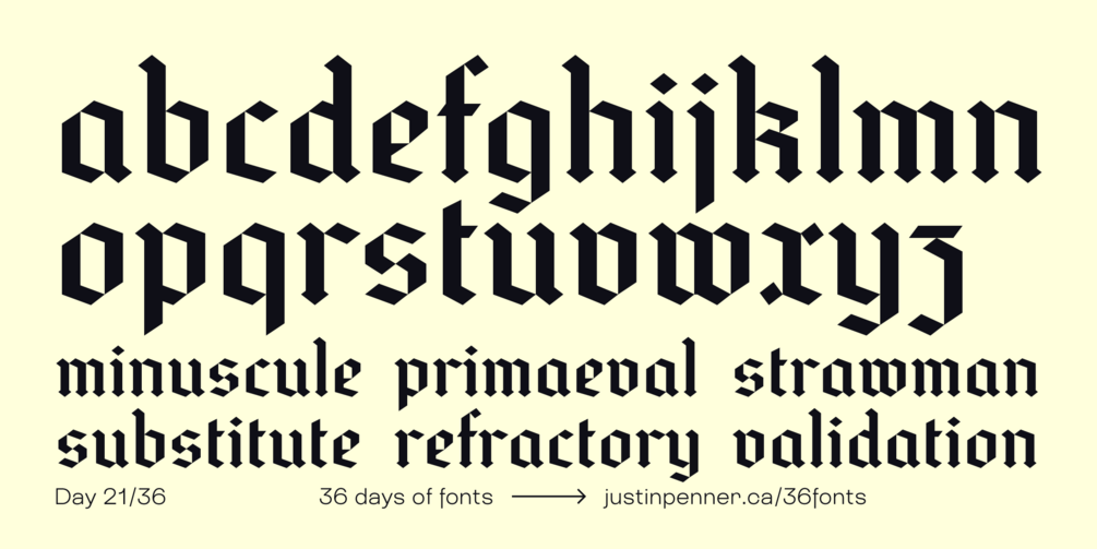 Follow the 36 Days of Fonts project for a new font every day! Post your feedback on Instagram or send me an email justin@justinpenner.ca. If you use this font, show me your work or tag it #36fontsinuse, and if you want to see it expanded to a full character set, let me know!