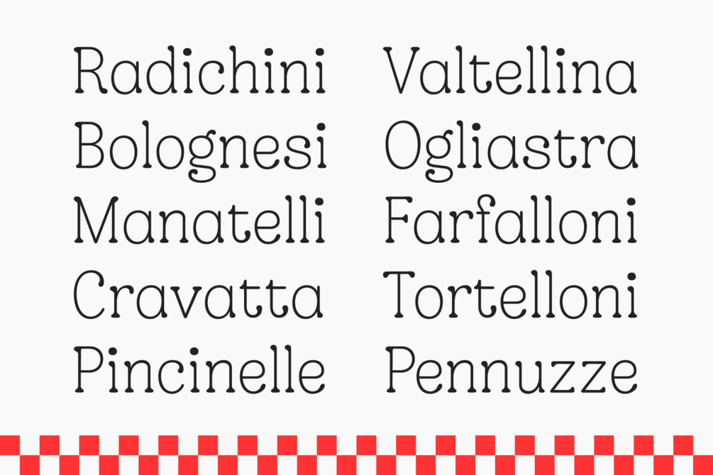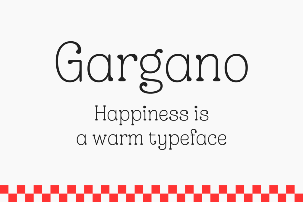 Gargano is comfort in a typeface. Like a bubbling pizza from a wood-fired oven, or a bowl of handmade mezzelune, this typeface is warm and friendly, and it'll make you warm and friendly, too!
