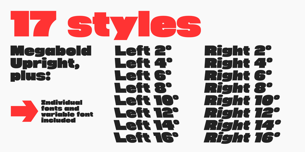 - Megabold Left (×8 slanted styles from 2–16°)